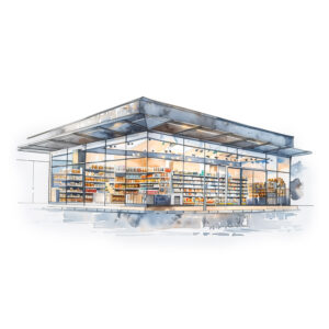 Watercolor illustration of convenience store on white background
