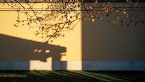 On a warm spring morning, the sun shines on the empty wall, the dappled shadows of tree branches and leaves are printed on the wall, and there are sparrows on the branches of the wall for product pres
