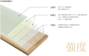 天然木の表面は5層のウレタン塗装によりキズがつきにくくなります。中塗りにあたる部分は柔軟性のある塗料を使用し衝撃をやわらげる工夫がされています。