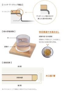 特殊なウレタン塗装によって水濡れ、水の浸透からワークトップを保護しています。