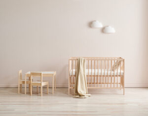 Modern wooden crib and baby room style, pink wall and cabinet de