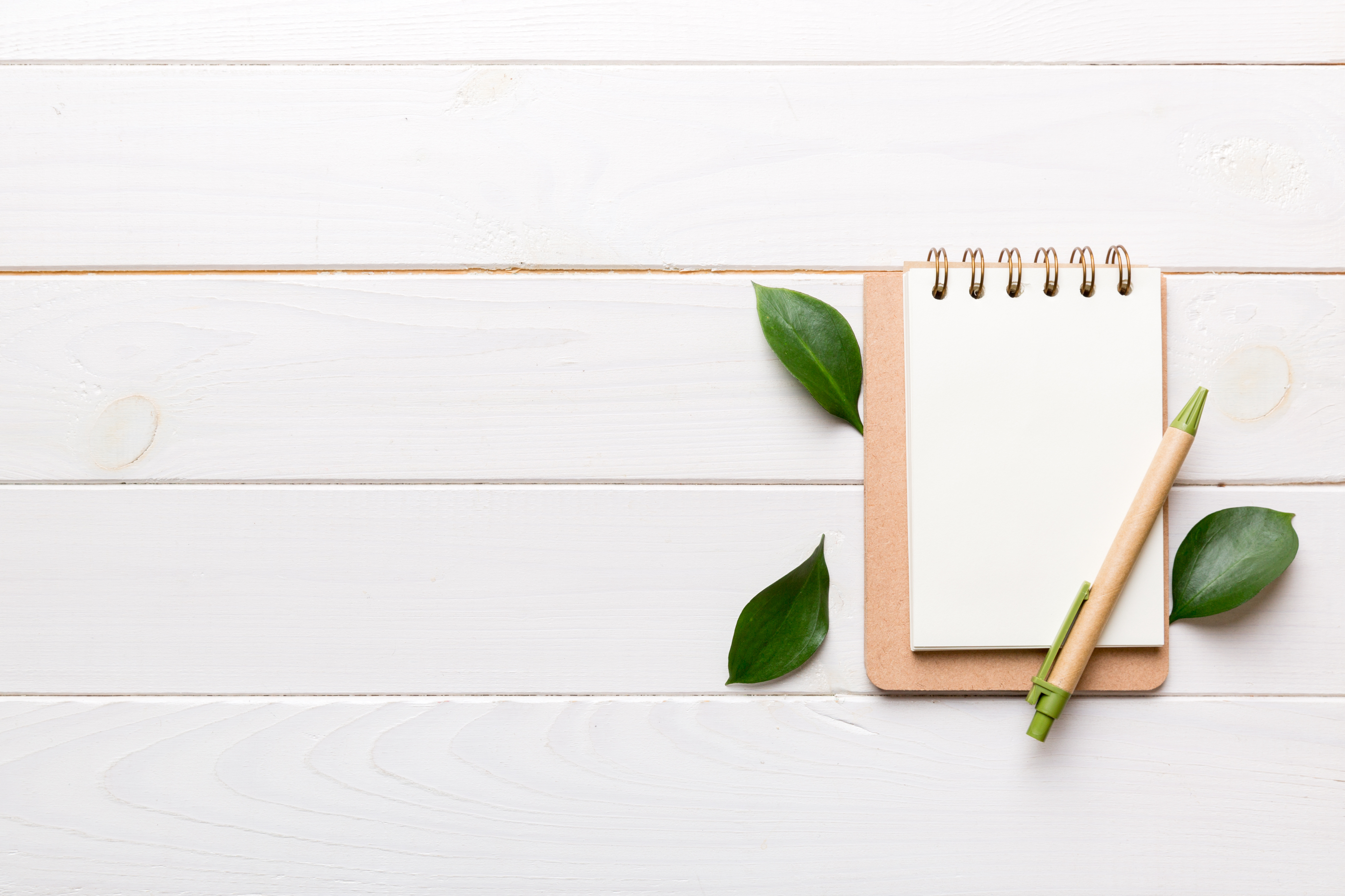 eco-friendly Empty notebook with pen and green leaf on Colored background for note