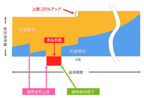 変動型の住宅ローン金利は半年ごとに見直しされますが、元利均等返済の返済額の見直しは5年ごと、新しい返済額の上限は1.25倍までです。この返済額が変わらない5年間に急激な金利上昇が起きて、半年ごとの金利見直しで金利が上がると、利息部分の金額が返済額よりも多くなる可能性があり、その返済額を上回った利息部分の金額のことを「未払利息」と呼びます。