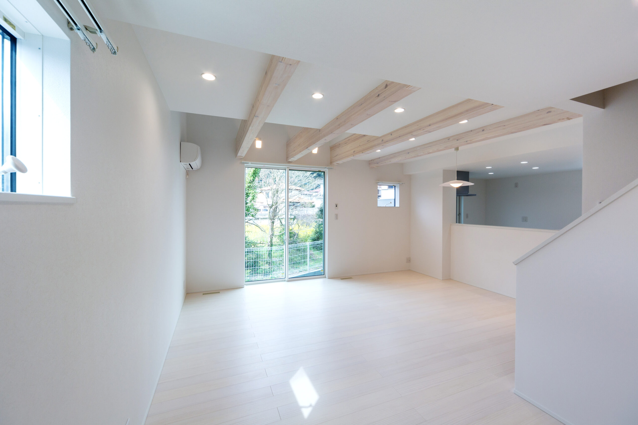 - 吹き抜けと相性の良い、スケルトン階段や見せ梁は、吹き抜けリビングをより明るくおしゃれな空間に作り上げる。