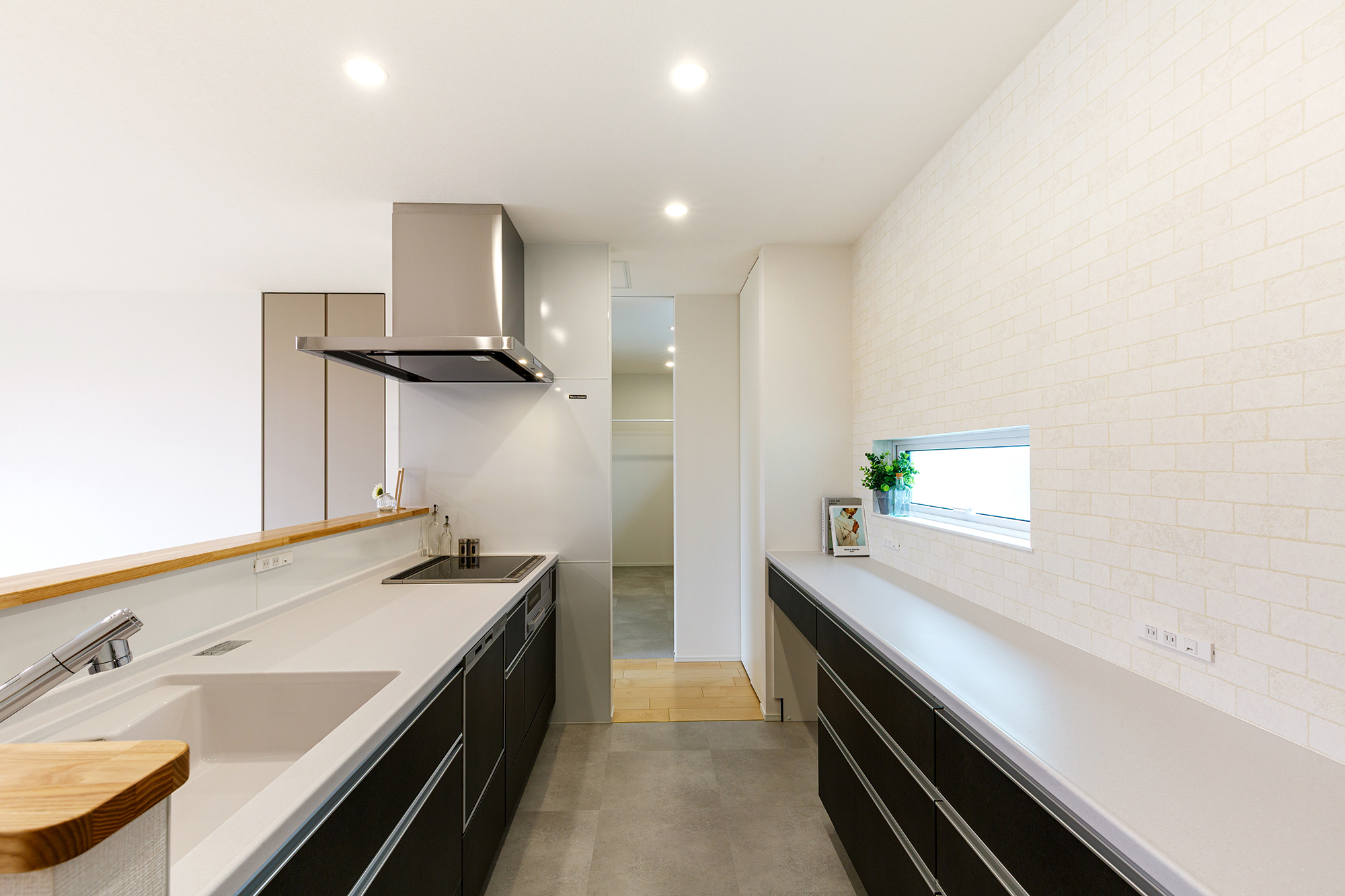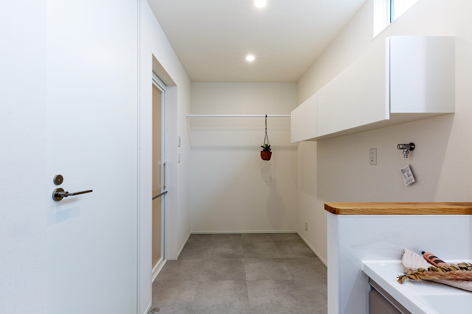 家事がしやすいよう水廻りは一直線上にまとめ、家事ラク動線に。